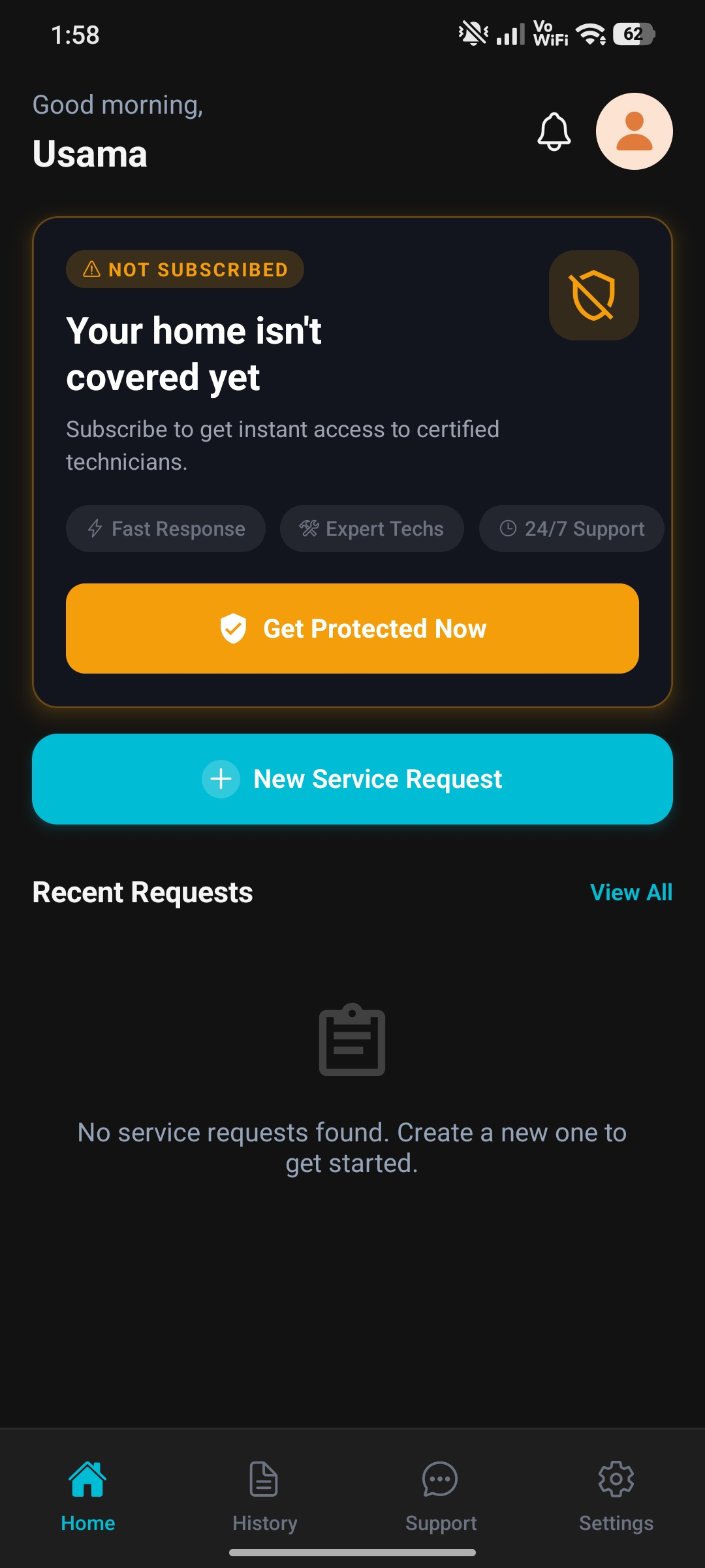 - Homeowners: Request services (e.g., plumbing), pick available slots, and manage subscription plans.